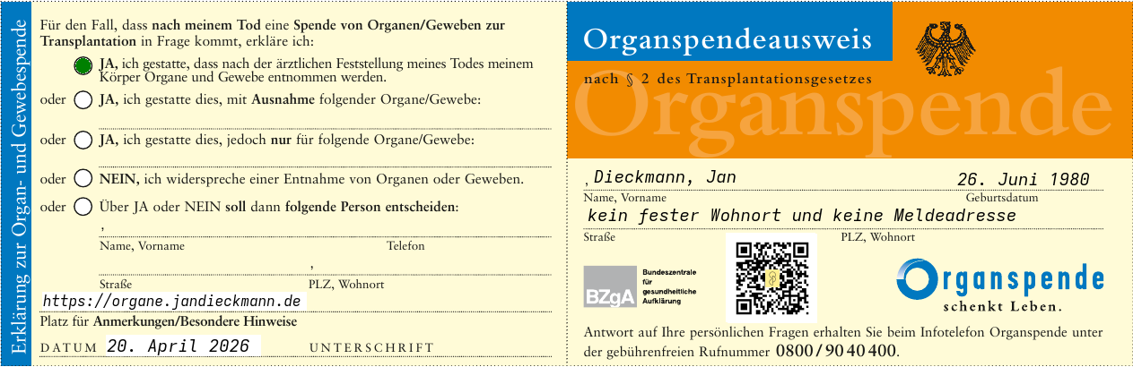 bestimme hiermit für den Fall, dass mein Tod ärztlich festgestellt wurde und meine Organe und Gewebe zur Transplantation in Frage kommen, diese entnommen werden dürfen. Angaben und Informationen zum medizinischen Umgang mit mir, wenn ich nicht bei Bewusstsein und nicht ansprechbar bin, habe ich in meiner Patientenverfügung festgehalten. Das folgende Dokument befindet sich in meinem Gepäck: